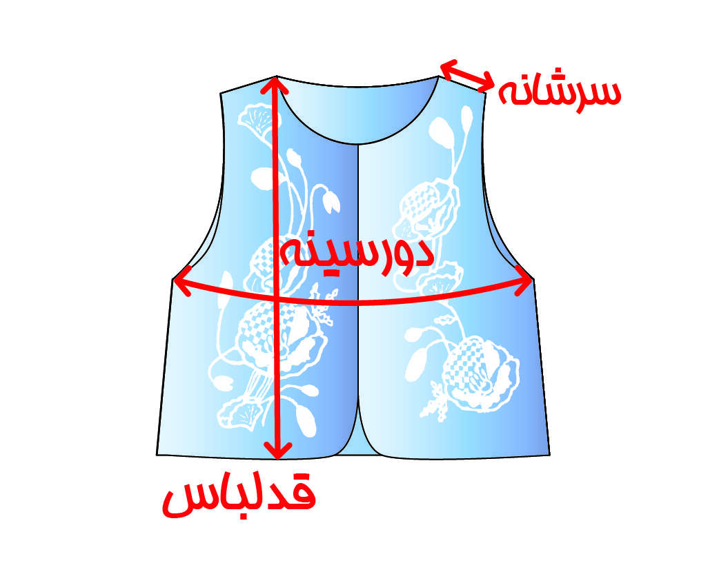 - قد جلیقه: قسمت راهنمای اندازه را بررسی بفرمایید.